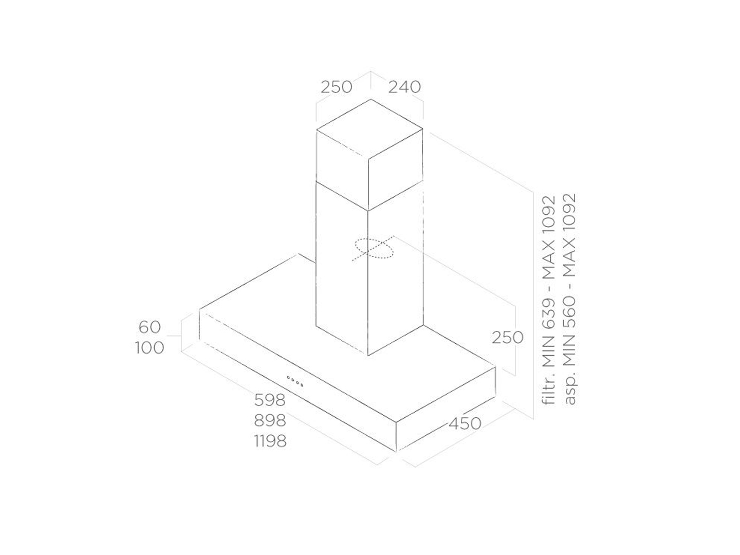 | Kích thước 60 – 70 – 90 cm | Phiên bản Ống thoát | Loại Thép không gỉ | Loại đèn LED 2 x 2,5 W |