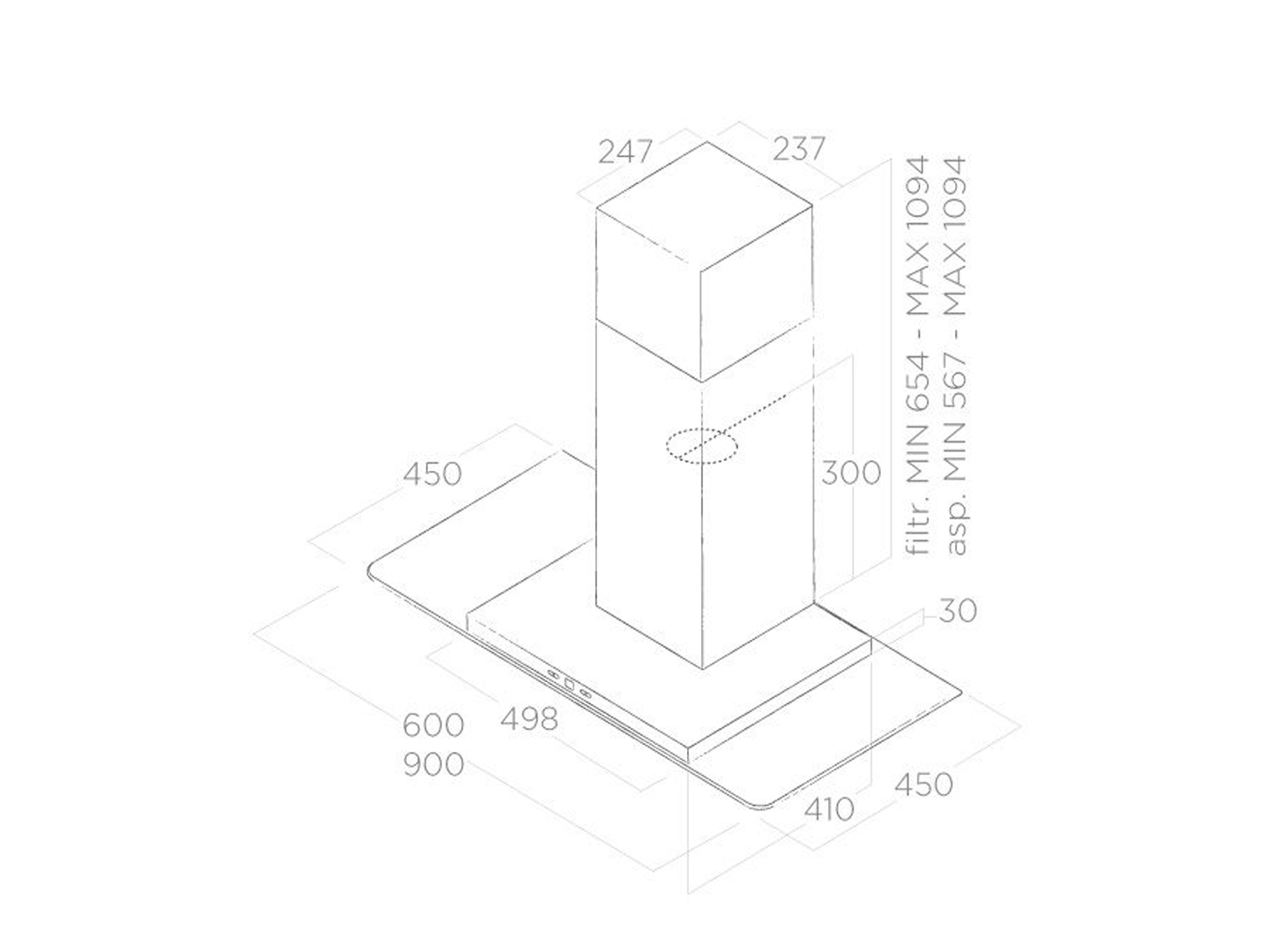 | Kích thước 60 – 90 cm | Phiên bản Ống thoát | Loại Thép không gỉ + kính | Loại đèn LED 2 x 2,5 W |