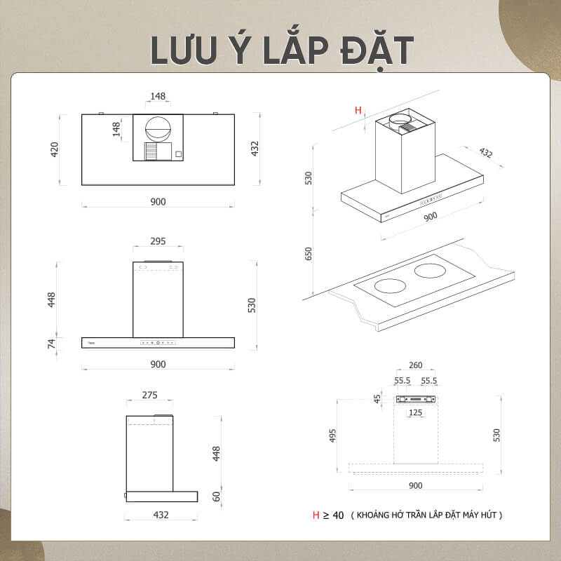 | Lưu lượng hút gió | 795 m3/h không gắn lọc carbon 477 m3/h gắn lọc carbon |